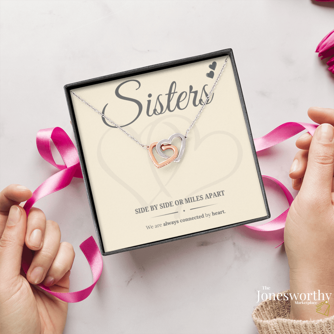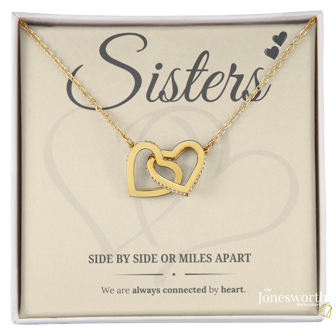 Sisters Interlocking Heart Necklace – Meaningful Sister Gift, Side by Side or Miles Apart, Gold Heart Keepsake Jewelry