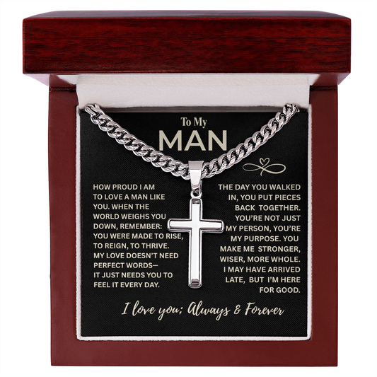 To My Man Gift – Artisan Cross Chain Necklace, Always & Forever Love Pendant Jewelry, Meaningful Gift for Boyfriend, Husband, Him